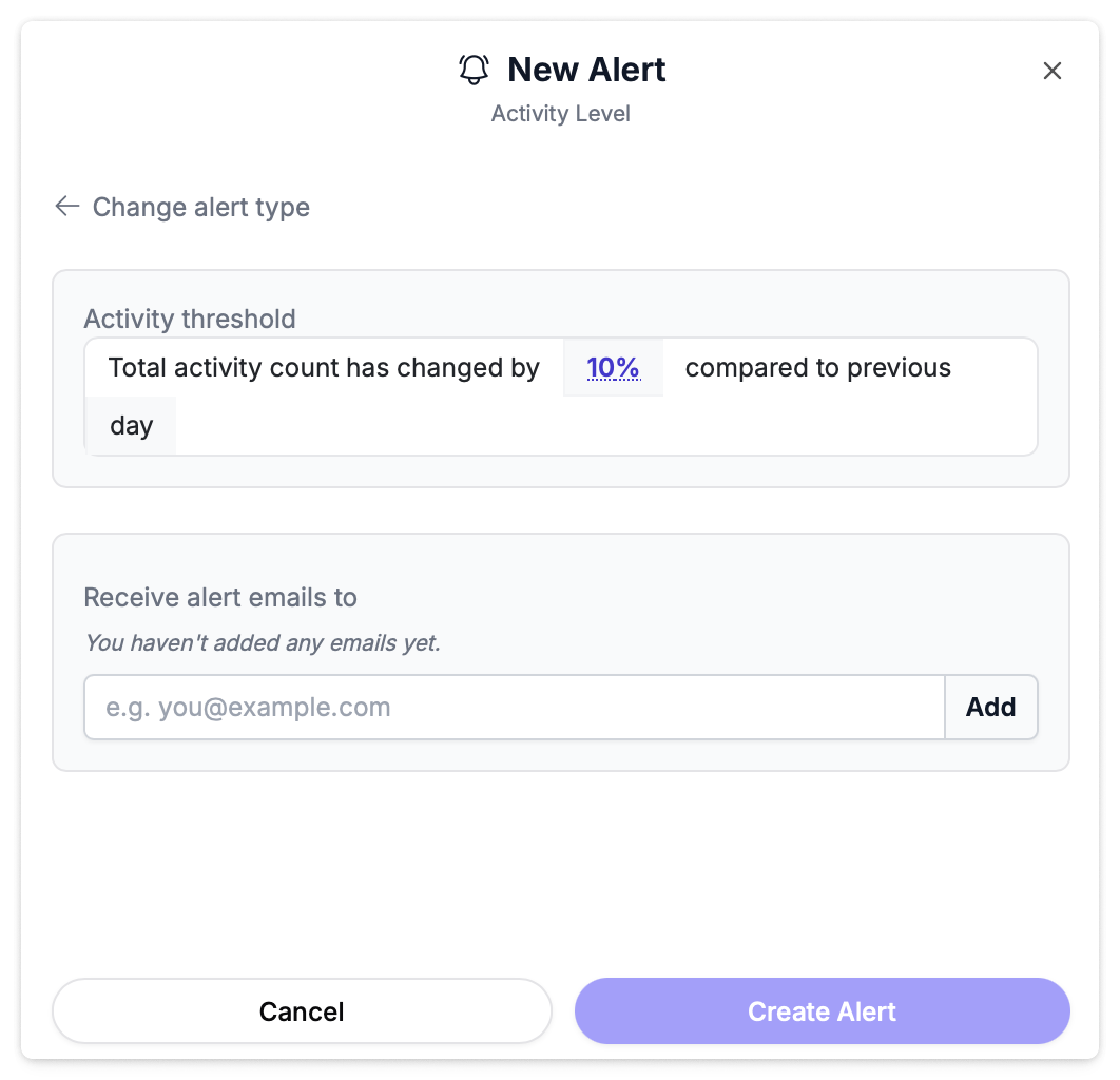 How it works: The platform compares total activity count for the current period against the same length period immediately before it. If the increase exceeds your threshold, the alert fires. Runs once per calendar day maximum.