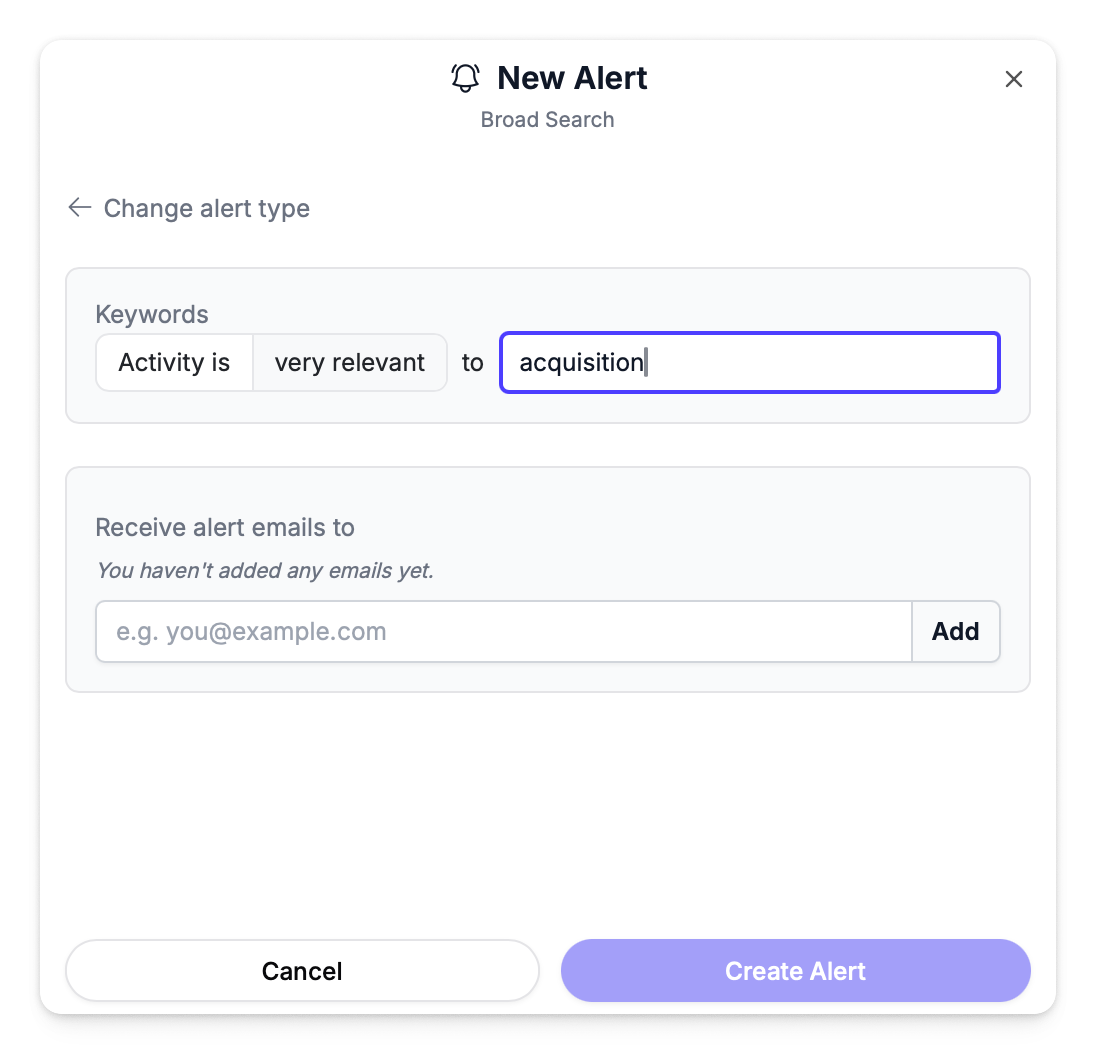| Keywords | The topic or term to monitor (e.g., "Acquisition", "CEO departure") |