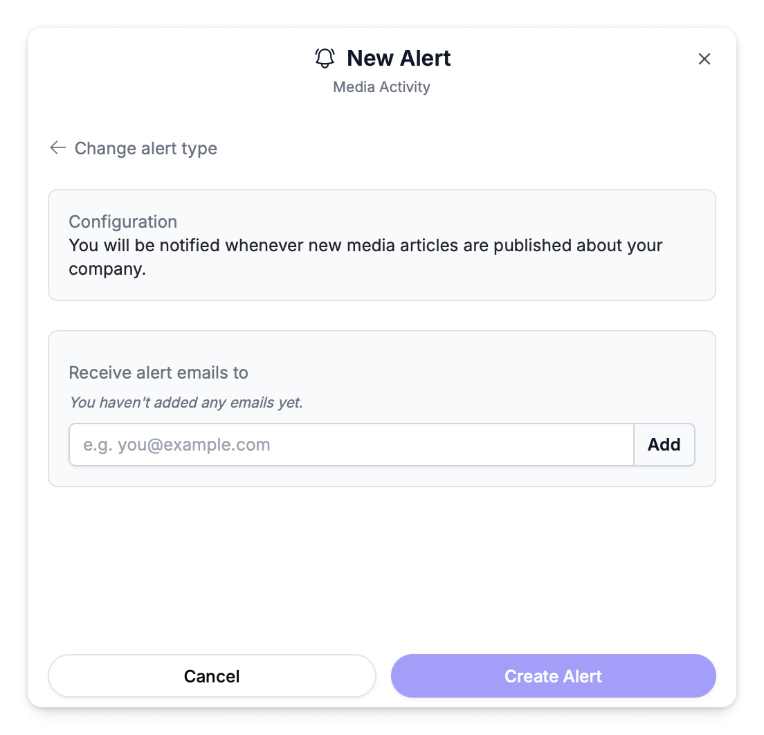 How it works: As new media articles are ingested from tracked news sources, the platform immediately sends an email with the article details and sentiment score. This is the simplest alert type and one of the most useful — it ensures you never miss news coverage.