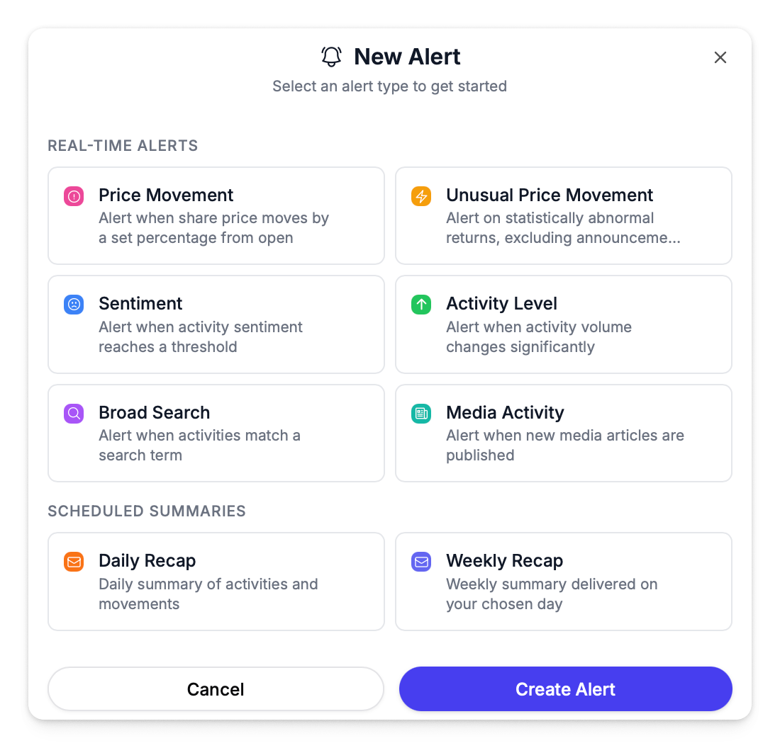 Stay ahead of what matters — get notified by email when the market moves, sentiment shifts, or your company appears in the news.