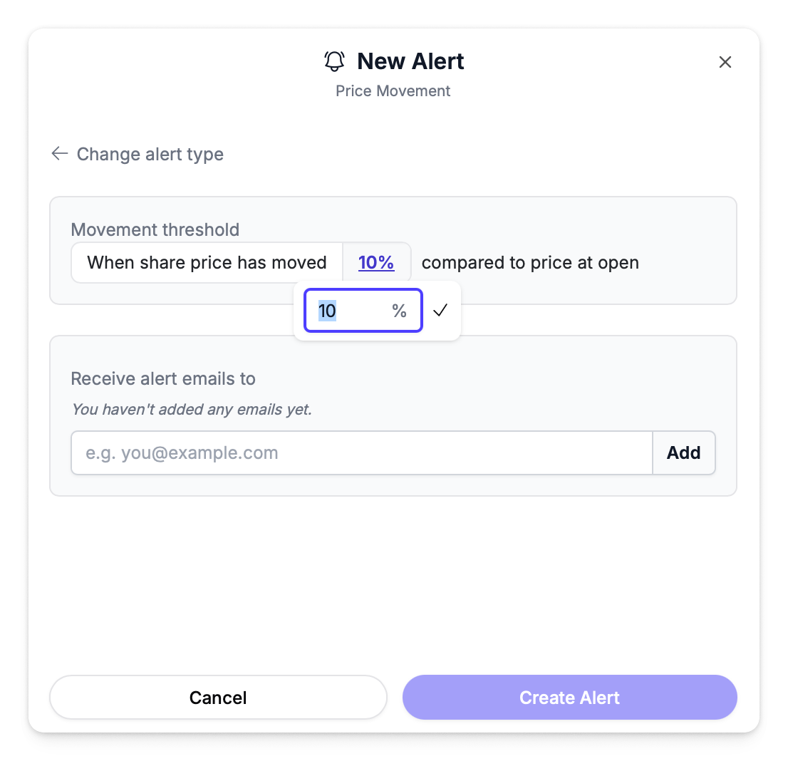 How it works: The platform checks your share price while the market is open. When the percentage change from open exceeds your threshold, an email is sent with the current price and percentage change.