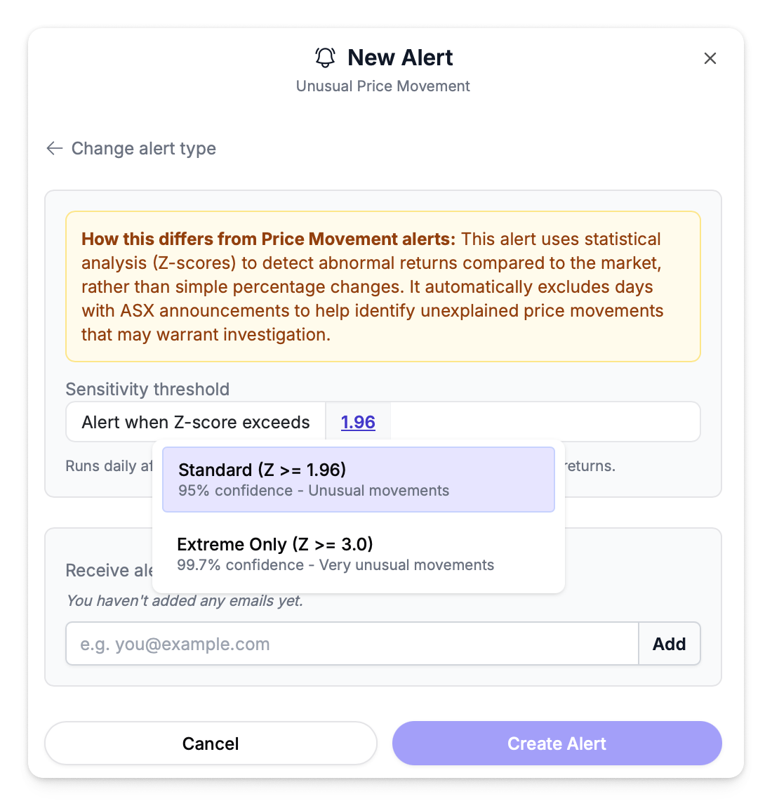 How it works: Runs daily after market close. The platform calculates expected returns using the CAPM model and your configured benchmark, then compares actual returns against this expectation. If the resulting Z-score exceeds your sensitivity threshold and there were no ASX announcements that day, the alert triggers. Maximum one alert per day.