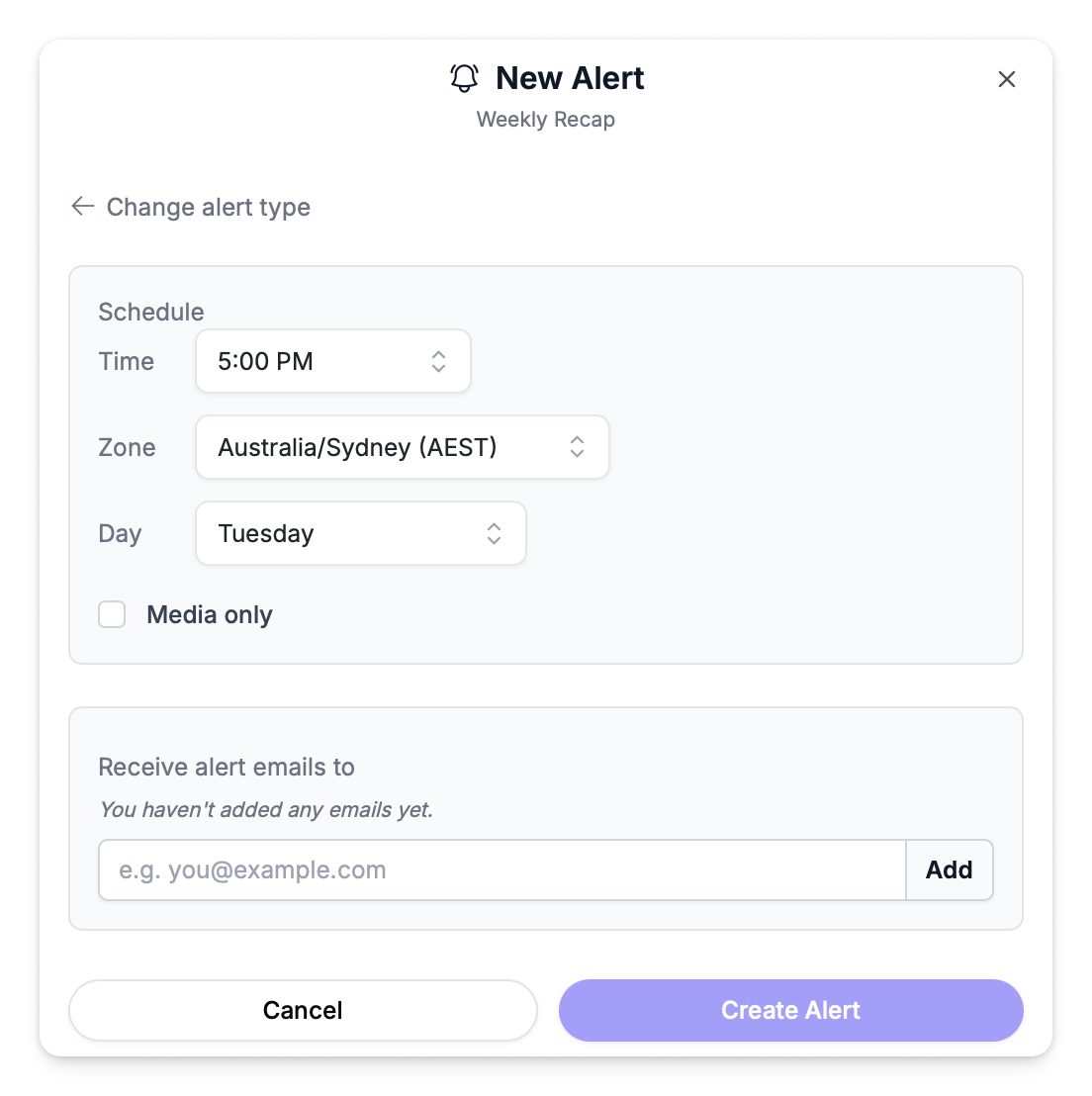 - Schedule — change delivery time, timezone, or day (for recaps)