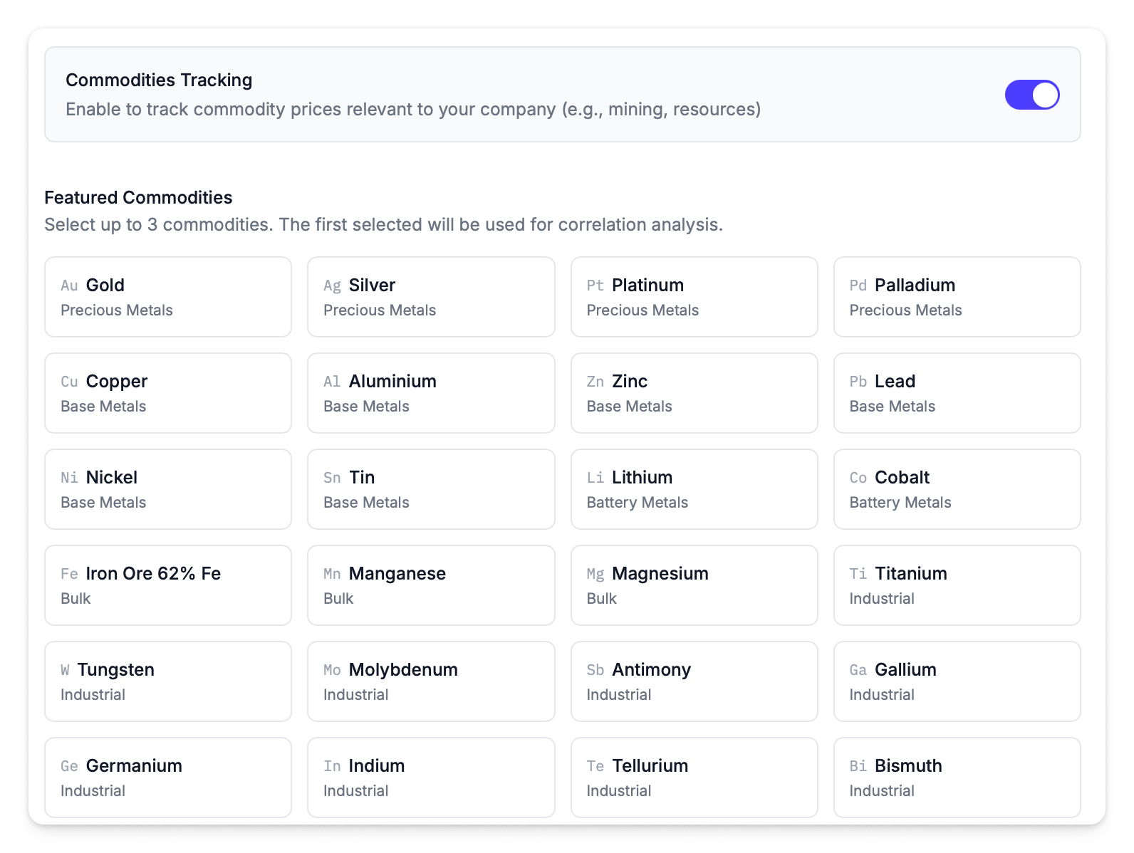 Select up to three commodities relevant to your company. Featured commodities appear in the dashboard stats bar with live prices.