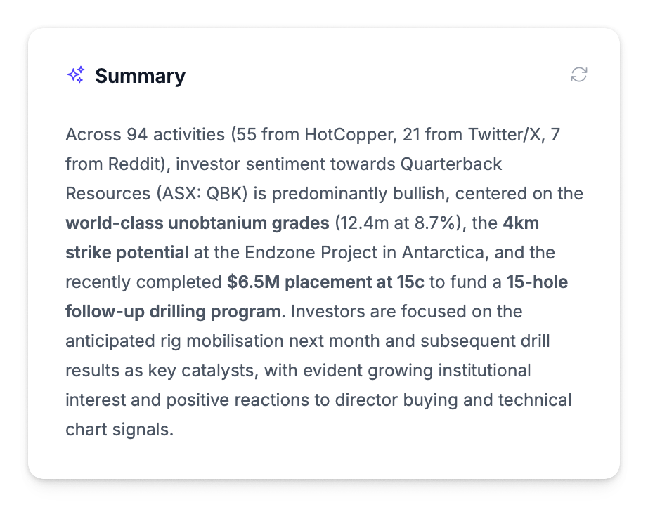 Insights reference your configured benchmark and commodity movements when relevant. A gold miner's insights will naturally reference gold price, while a tech company's will focus on index performance.