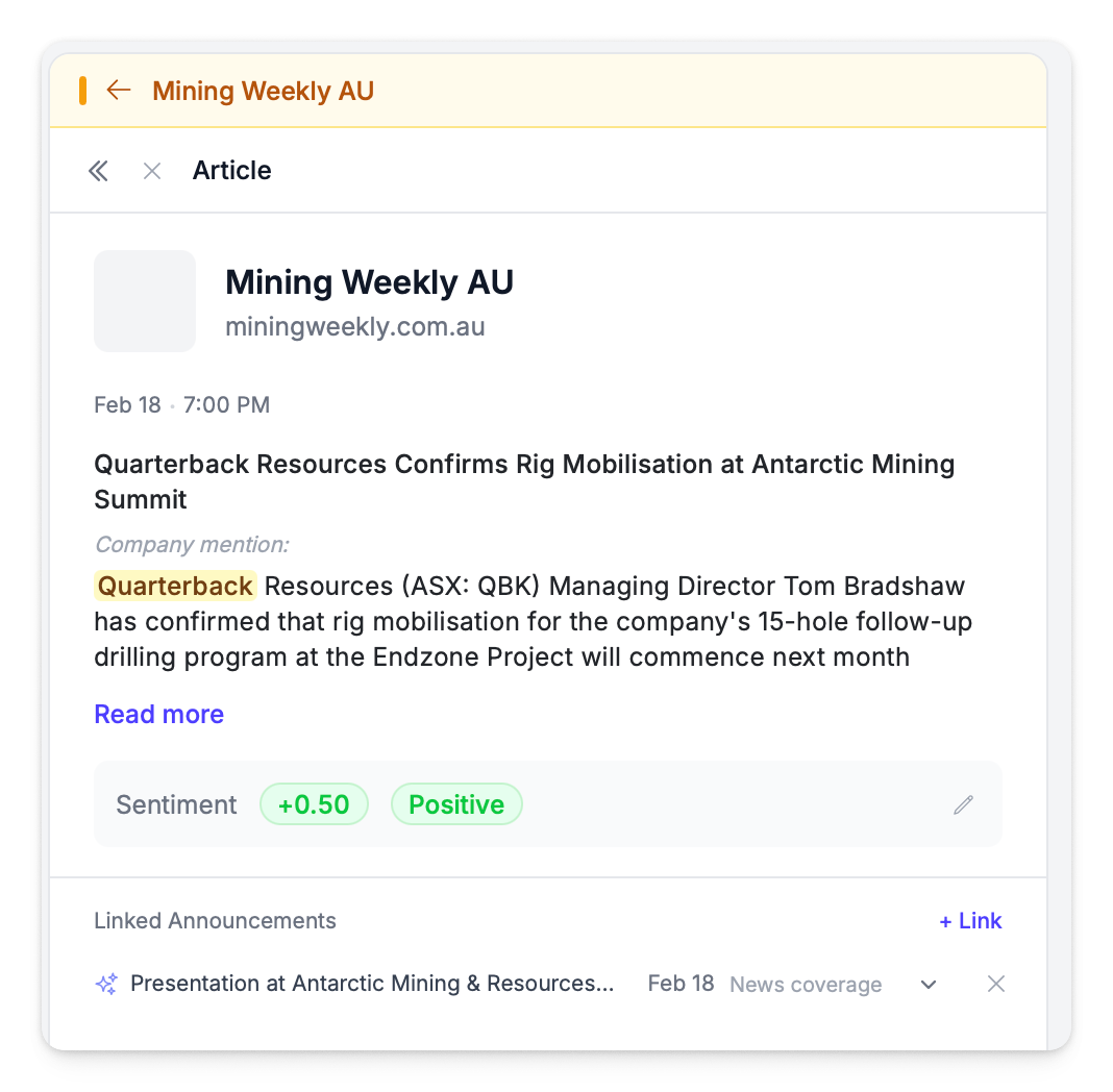- Highlighted mention — the section of the article where your company is mentioned is shown first, with the relevant passage highlighted